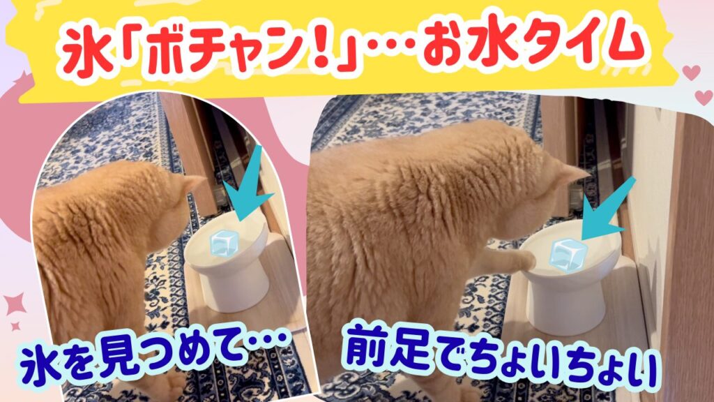 ミッキーがお水のそばにいる時に、わざと高い位置から氷を「ボチャンっ!」と落とします。すると、「何ごと…?」という顔でお水に近寄り、中を見つめた後、前足でちょいちょいと氷を触って遊び始めます。この「前足ちょいちょい」がなんとも可愛くて、いつも笑ってしまいます。その後、満足そうにお水をゴクゴク飲んでくれます。