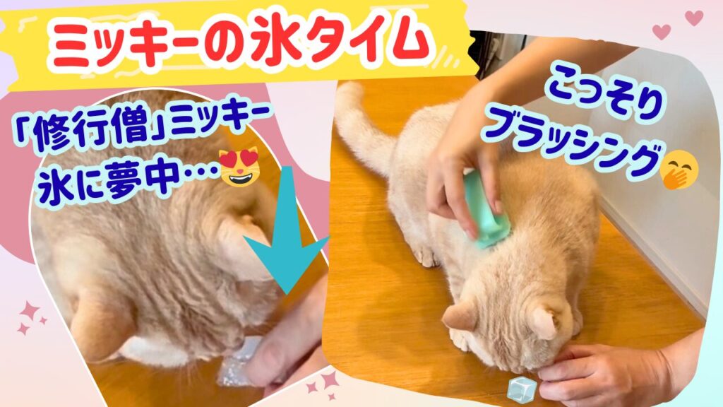 ミッキーは氷が大好き。冷凍庫から氷を出す音を聞きつけると、急いでテーブルの上に乗ってきます。心を「無」にして氷をなめる姿は、まるで「修行僧」そのもの。その隙にこっそりブラッシングをして抜け毛を取るのが、飼い主の密かな楽しみです。(過去ブログ→ミッキー、氷はじめました)