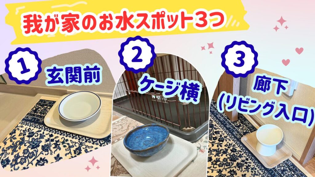 ミッキーになるべくお水を飲んでもらうため、お水は3箇所、滞在時間が多い場所(玄関前・ケージ横・廊下)に置いています。1日3回の交換で、ひげが当たらないように間口の広い器を使っています。また、猫にとって給水スポットが多いことは、自分のテリトリー内を自由に移動しながらリラックスでき、居場所を選べる安心感につながるというメリットもあります。
