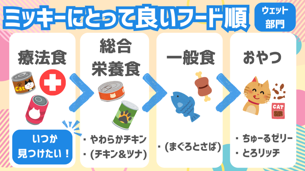 その中でミッキーにとっての優先順は、イラストの通りです。下に記載しているフード名は現在ミッキーが食べられるウェットフードです。(ドライフードは別)