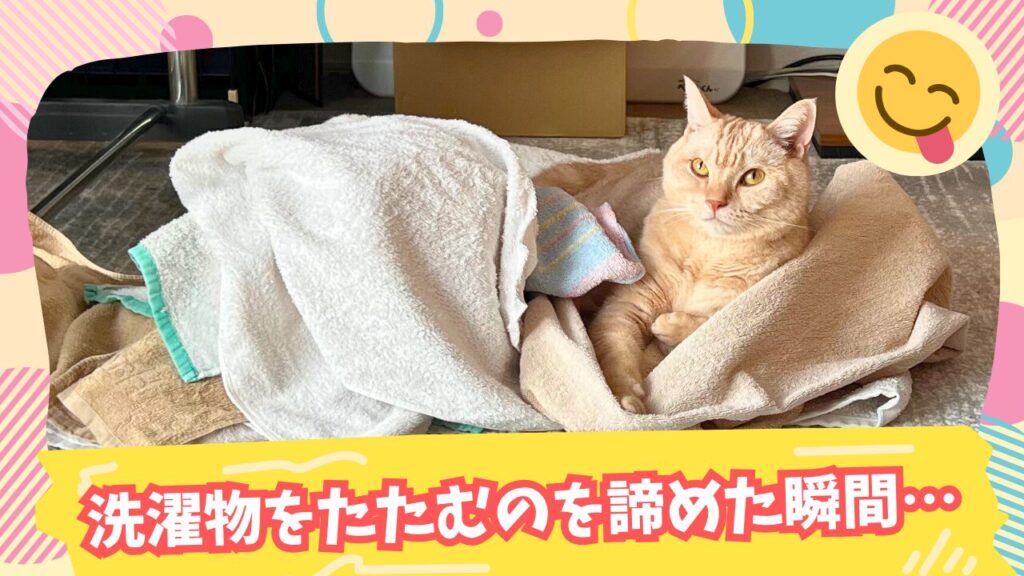今日も元気に過ごしてくれているミッキー。取り込んだ洗濯物が大好きで、畳もうとするとこうなります…。これはもう諦めるしかありません。自分のニオイをつけているのでしょうか? そんな姿を見ると、病気と闘いながらも小さな楽しみを見つけてくれていることが嬉しくなります。